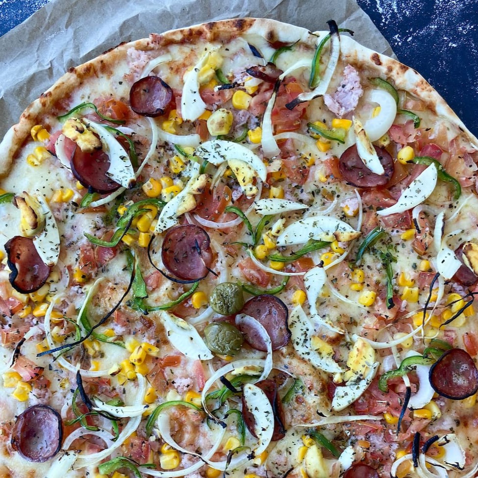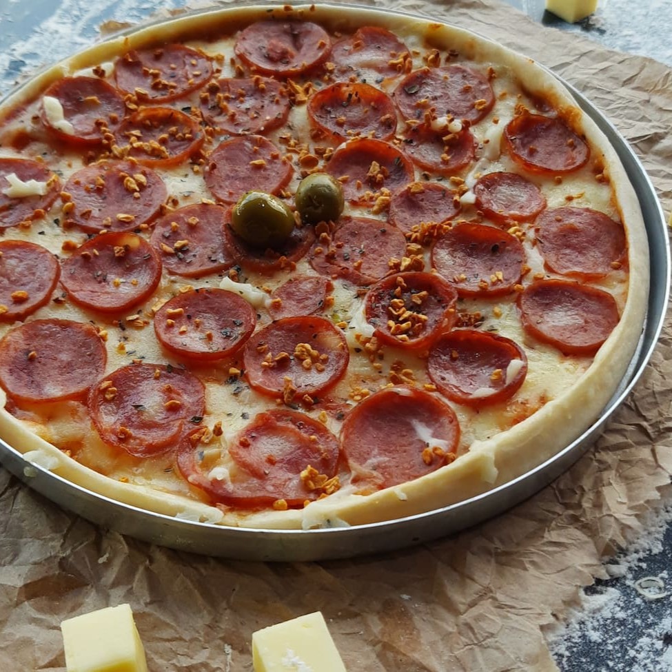 família (40 cm) calabresa, mussarela, molho de tomate, cebola, azeitona e orégano.