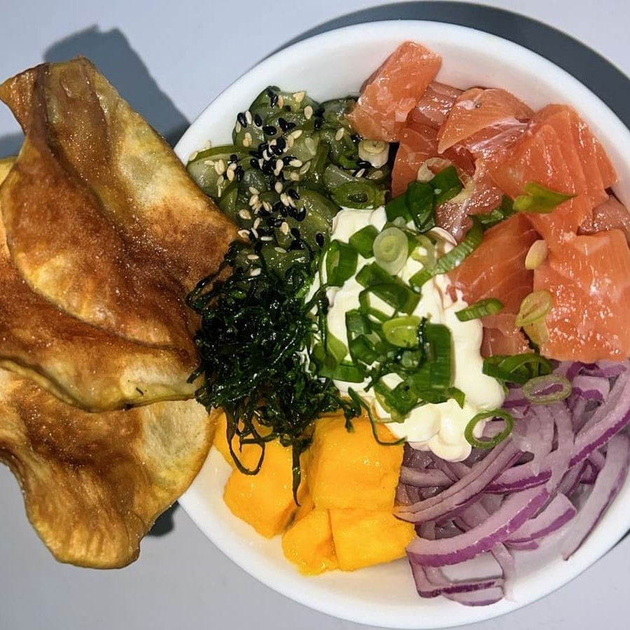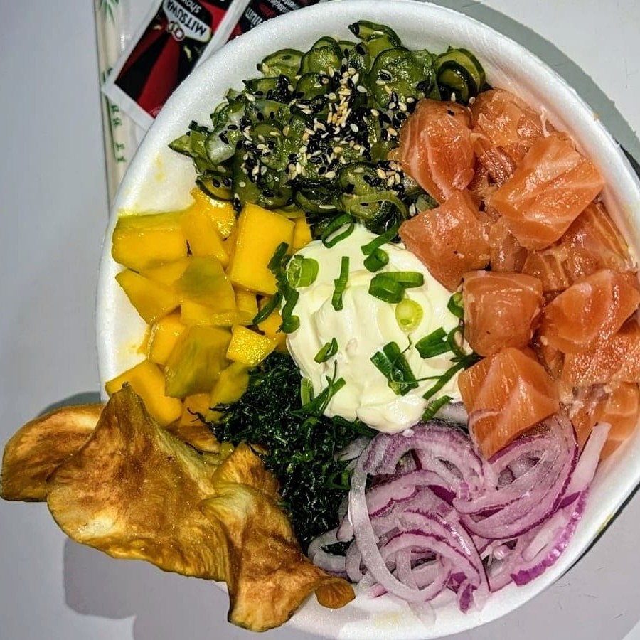 Apresentamos o 'Poke Filadélfia', nosso Especial do Dia. Uma combinação harmoniosa de arroz tenro, salmão fresco e cremoso cream cheese. A cebolinha adiciona um toque refrescante, enquanto o gergelim confere uma textura crocante inigualável. O crispy acrescenta leveza e o sabor doce e suculento da manga contrasta perfeitamente com o pungente sabor da cebola roxa. Um prato de 200g, repleto de sabores e texturas surpreendentes para uma experiência culinária única!