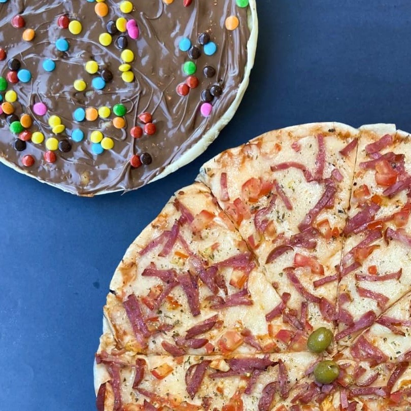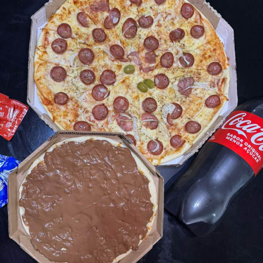 Pizza grande 35 cm + pizza brotão doce 25 cm + Coca cola 600 ml.