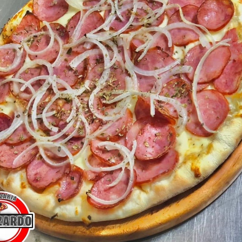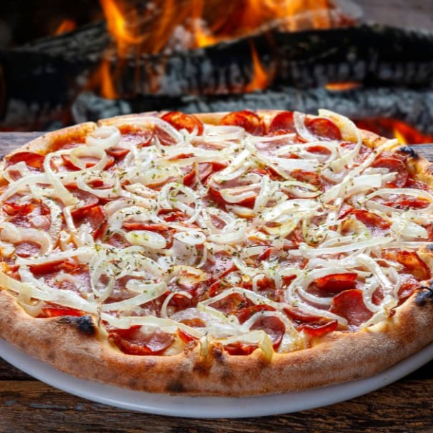 A pizza perfeita: molho de tomate suave, mussarela derretida, calabresa levemente picante e cebola caramelizada, finalizada com um toque de orégano.