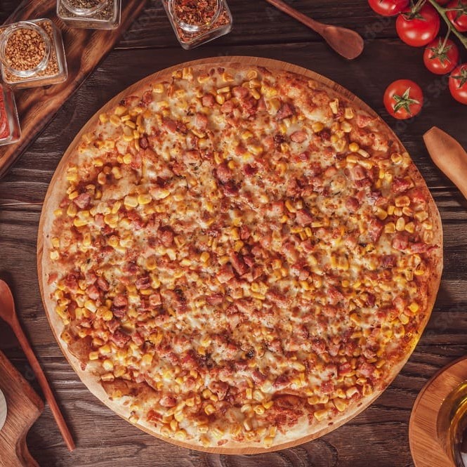 Deliciosa pizza artesanal, base molho de tomate tradicional, queijo mussarela, frango desfiado, milho, Catupiry Original, bacon em cubo finalizada com orégano.
