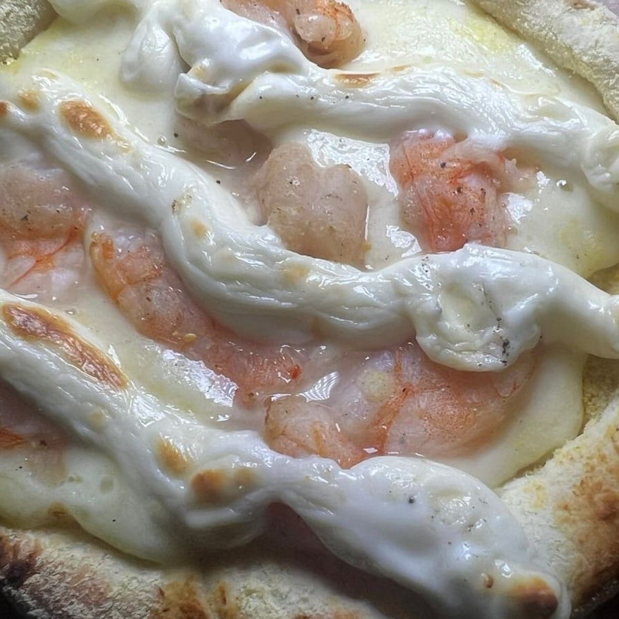 Mussarela, camarão e alho poro