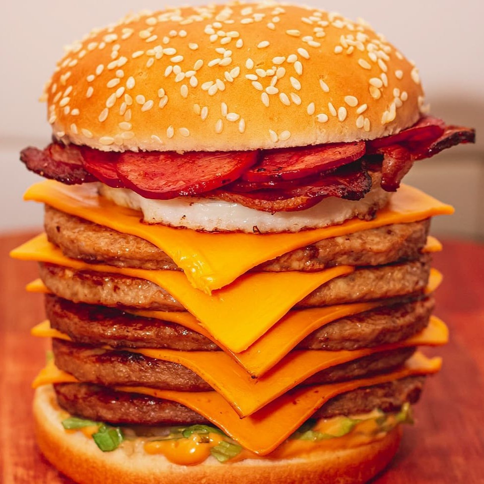 Pão de qualidade fresquinho , 05 carne perfeitamente suculenta , 05 deliciosa fatia de queijo cheddar ,ovo frito, Bacon frito, Calabresa fatiada , alface americana , molho especial.