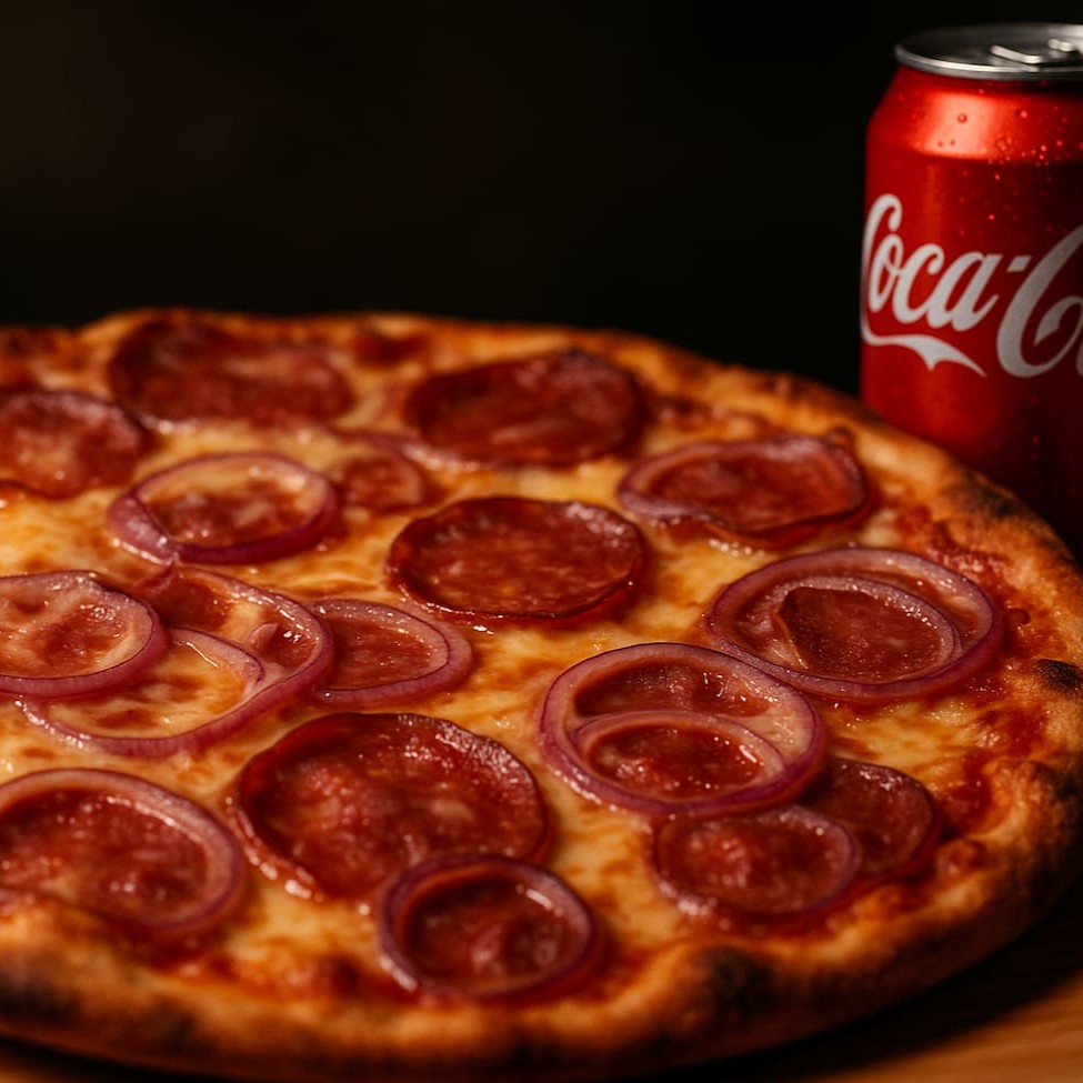Massa fina com borda crocante, molho artesanal, mozzarella derretida, rodelas de pepperoni e orégano + uma Coca-Cola de 1,5l.