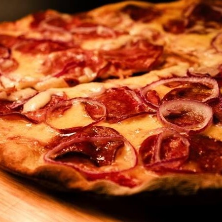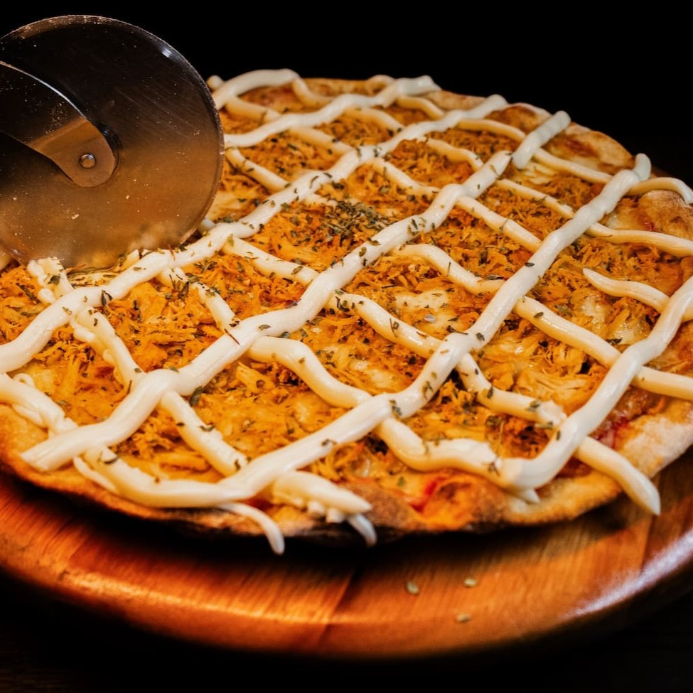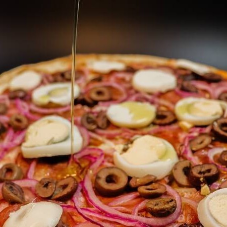 Massa fina com borda crocante, molho de tomate artesanal, mozzarella derretida, linguiça calabresa, cebola roxa e orégano