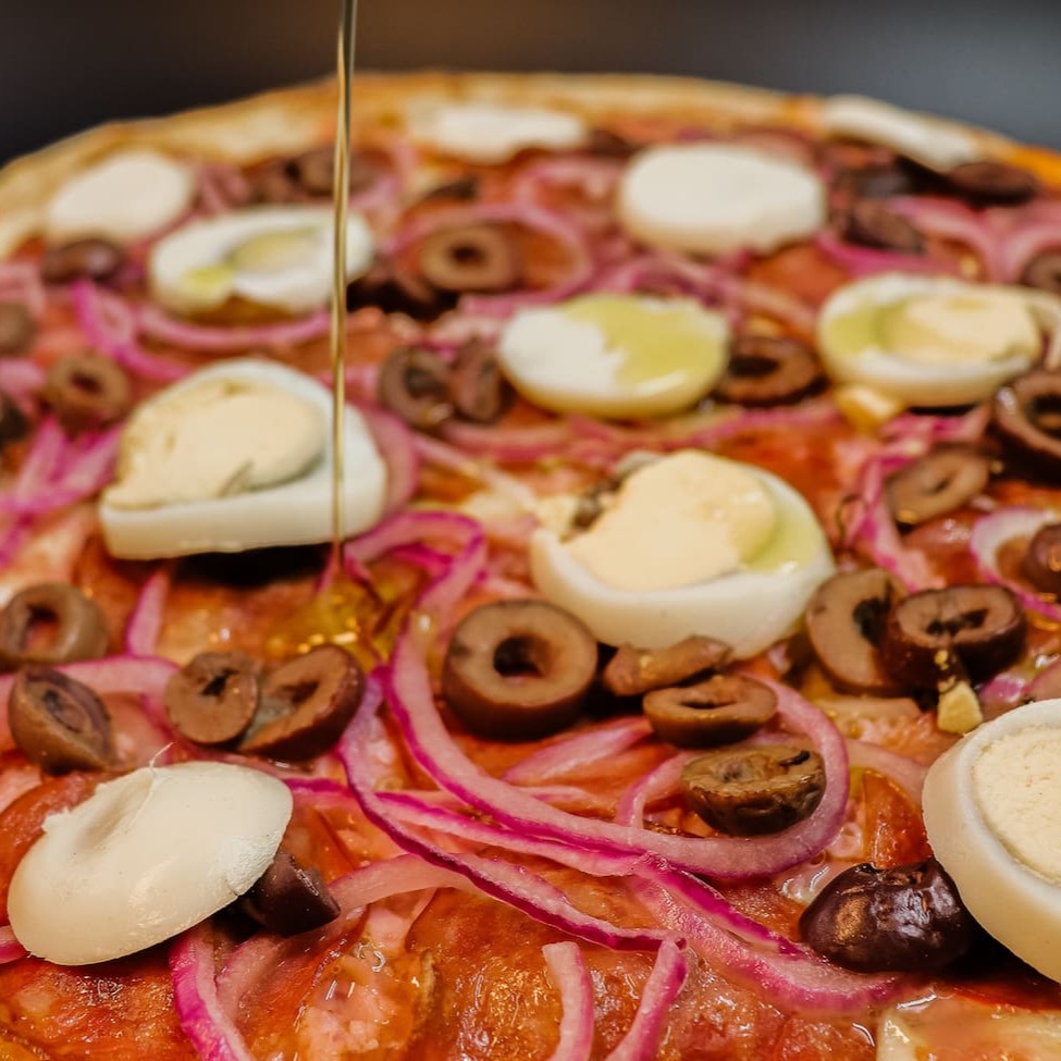 Massa fina com borda crocante, molho artesanal, mozzarella derretida, presunto ralado, linguiça calabresa, cebola roxa, ovos, azeitonas pretas e orégano + uma Coca-Cola 1,5l