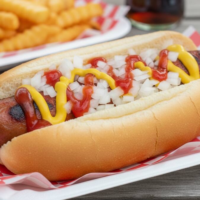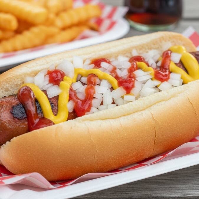 Pão de hotdog, linguiça calabresa fina, tomate e cebola.
