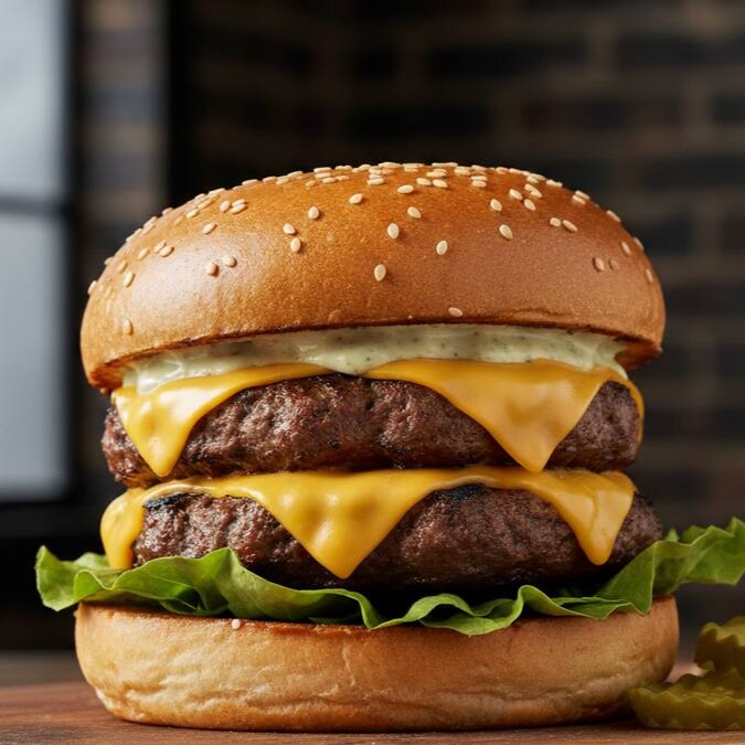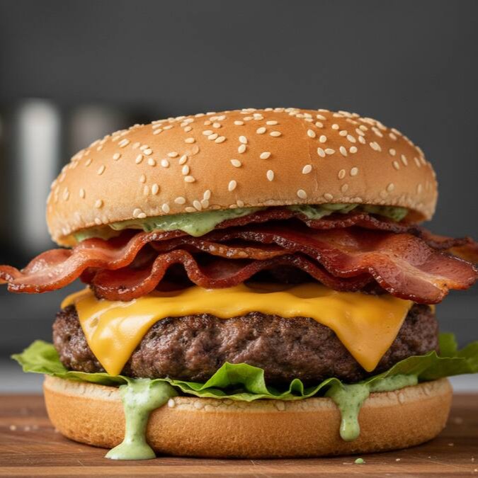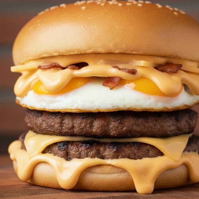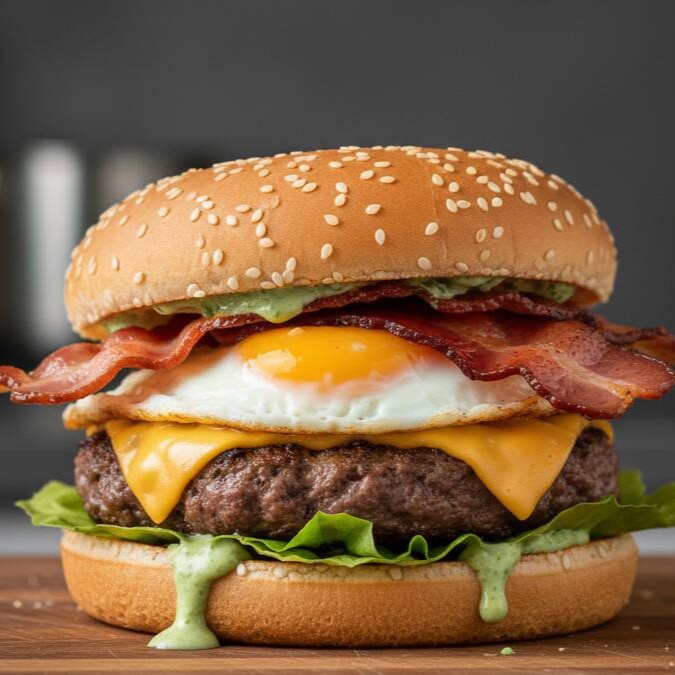 Pão, 2 carnes, 2 ovos, queijo, bacon e cheddar cremoso.
