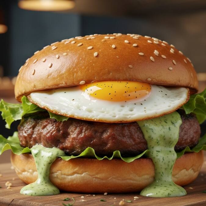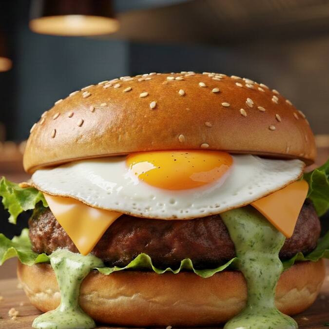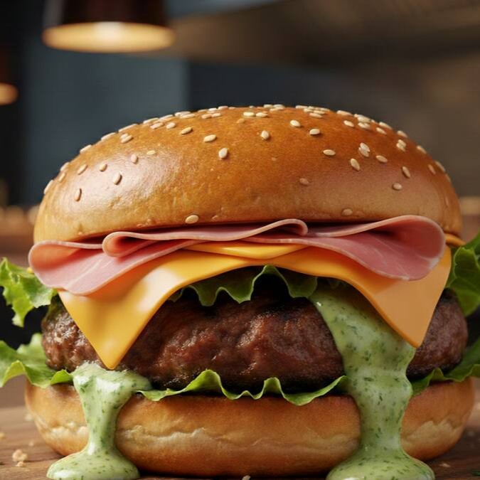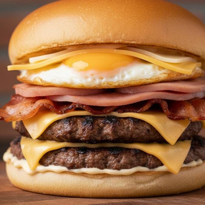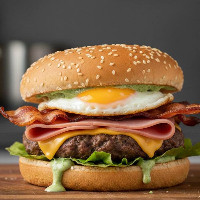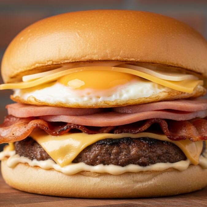 Pão, 2 carnes de picanha, queijo, presunto, 2 ovos e bacon.