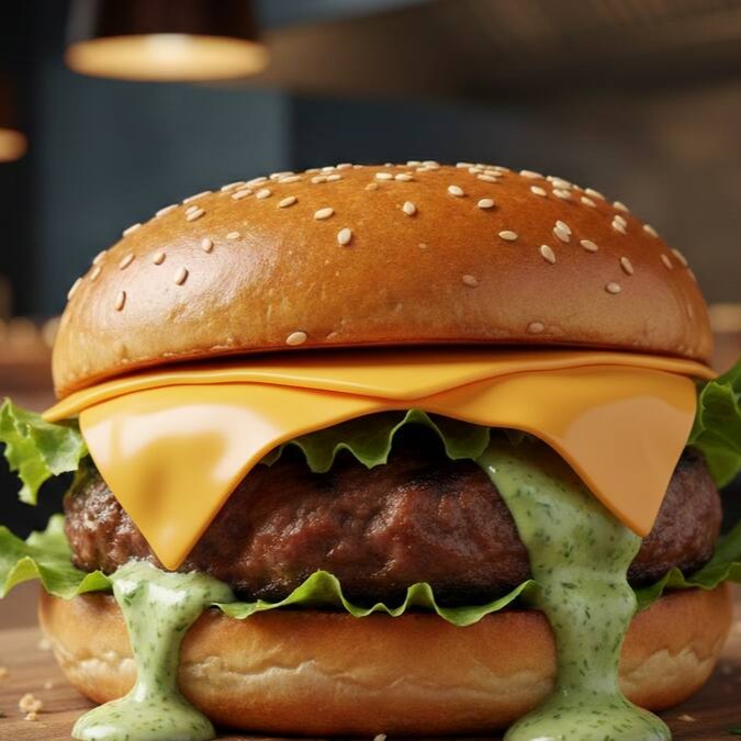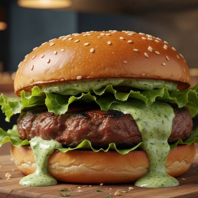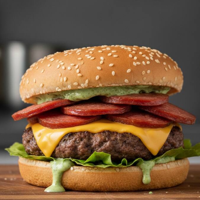 Pão, carne, queijo cheddar, generosas fatias de calabresa e molho verde do Pl.