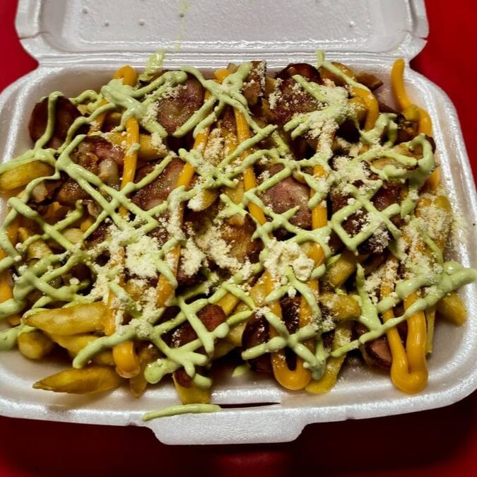 Porção de batata com 550g, linguiça calabresa em rodelas, bacon fatiado, cheddar cremoso, molho especial da casa e queijo ralado.