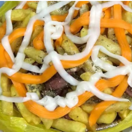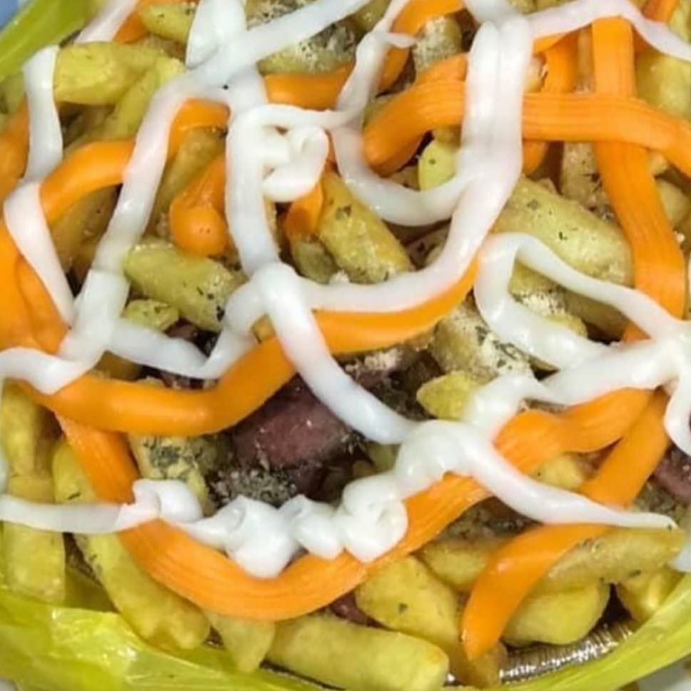 BATATA FRITA COM CALABRESA CHEDDAR CATUPIRY, MOLHOS, QUEIJO RALADO E ORÉGANO.