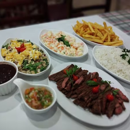 Acompanha: Arroz, feijão tropeiro, batata frita, maionese, feijão preto e molho à campanha