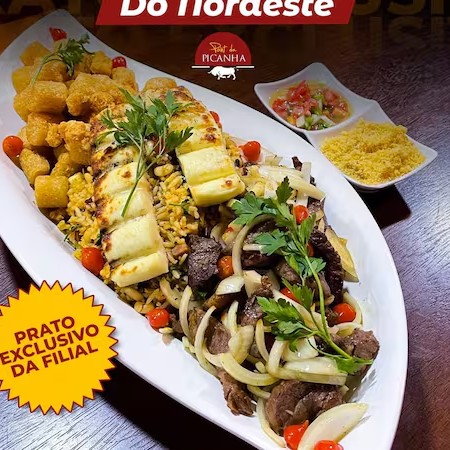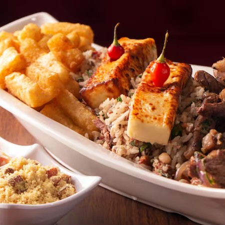 Carne de sol, baião de dois, aipim frito, queijo coalho, molho à campanha e farofa.