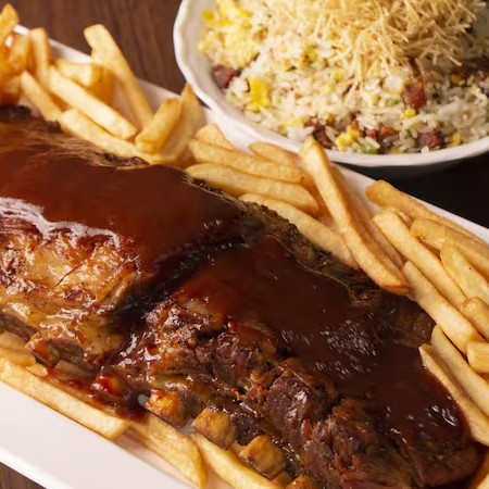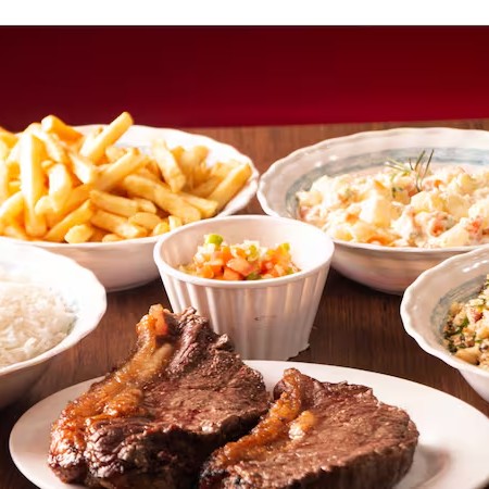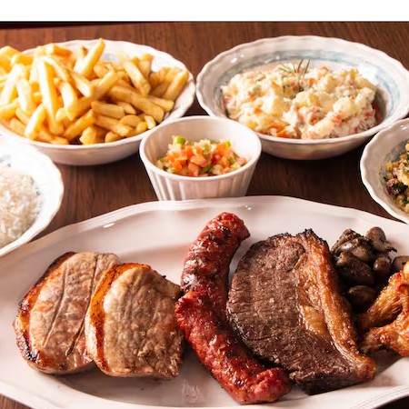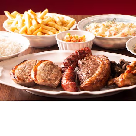 Acompanha: Contra file, suina, drumet, linguiça, coração, arroz branco, feijão tropeiro, maionese, batata frita, feijão preto e molho à campanha