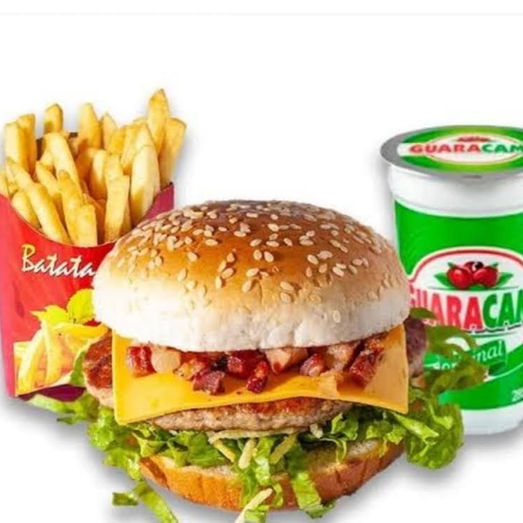 01 X triplo ( 03 carnes, 03 ovos,bacon,queijo cheddar, Presunto, alface,maionese, ketchup) batatinha pequena e um guaracamp
