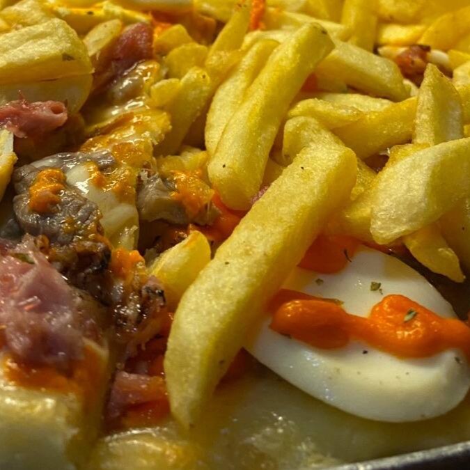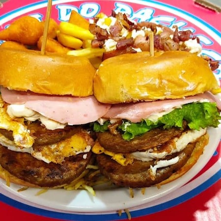 Pão, carne, ovo, bacon, presunto, queijo, salada e batata palha