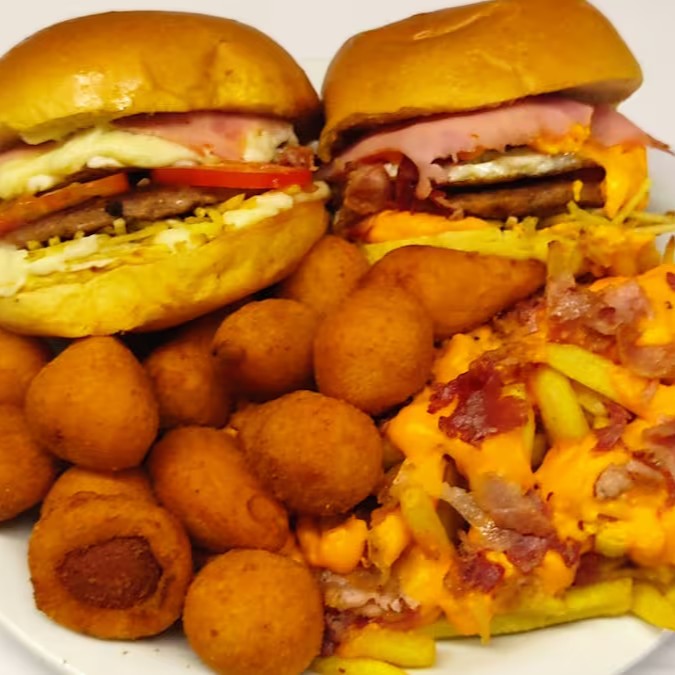 Dois lanches completos, caprichados com alface crocante, tomate fresco, bacon, presunto, queijo derretido, salada e batata palito. Uma explosão de sabor em dose dupla, perfeita pra matar a fome com muito mais prazer!