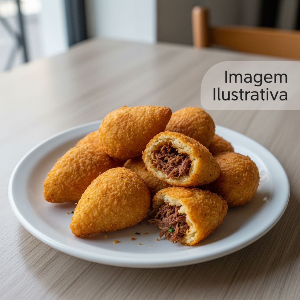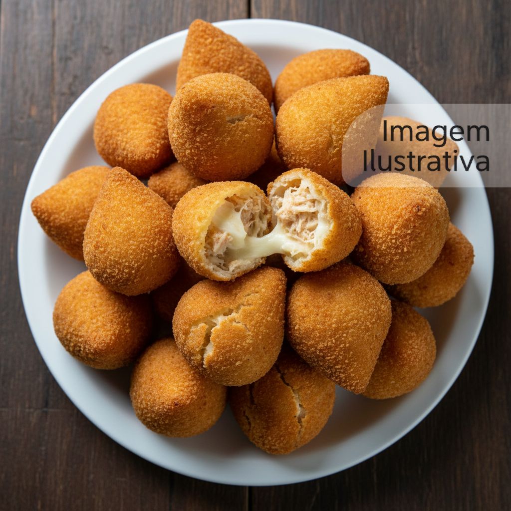 Coxinha recheada com frango desfiado e temperos especiais, envolta em uma massa crocante.