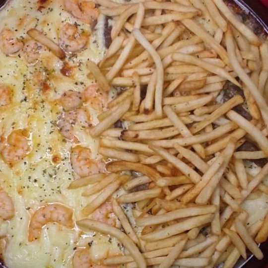 Meio A Meio De Contra Filé Com Fritas E Camarão C Requeijão