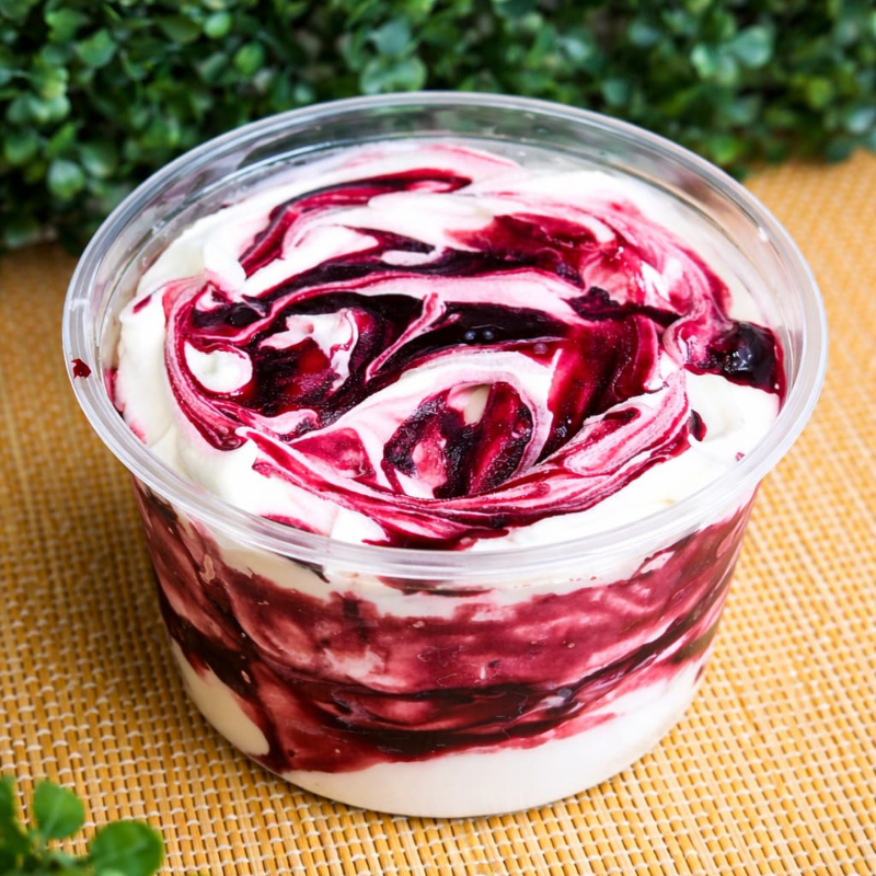 Delicioso sorvete de Iogurt grego com mesclas de amarena em caldas.