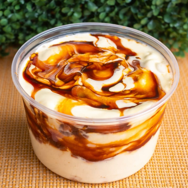 Sorvete sabor Banana mesclado com caramelo em caldas