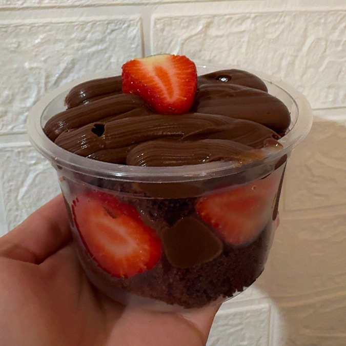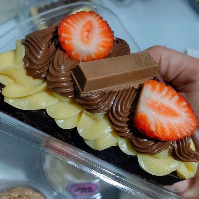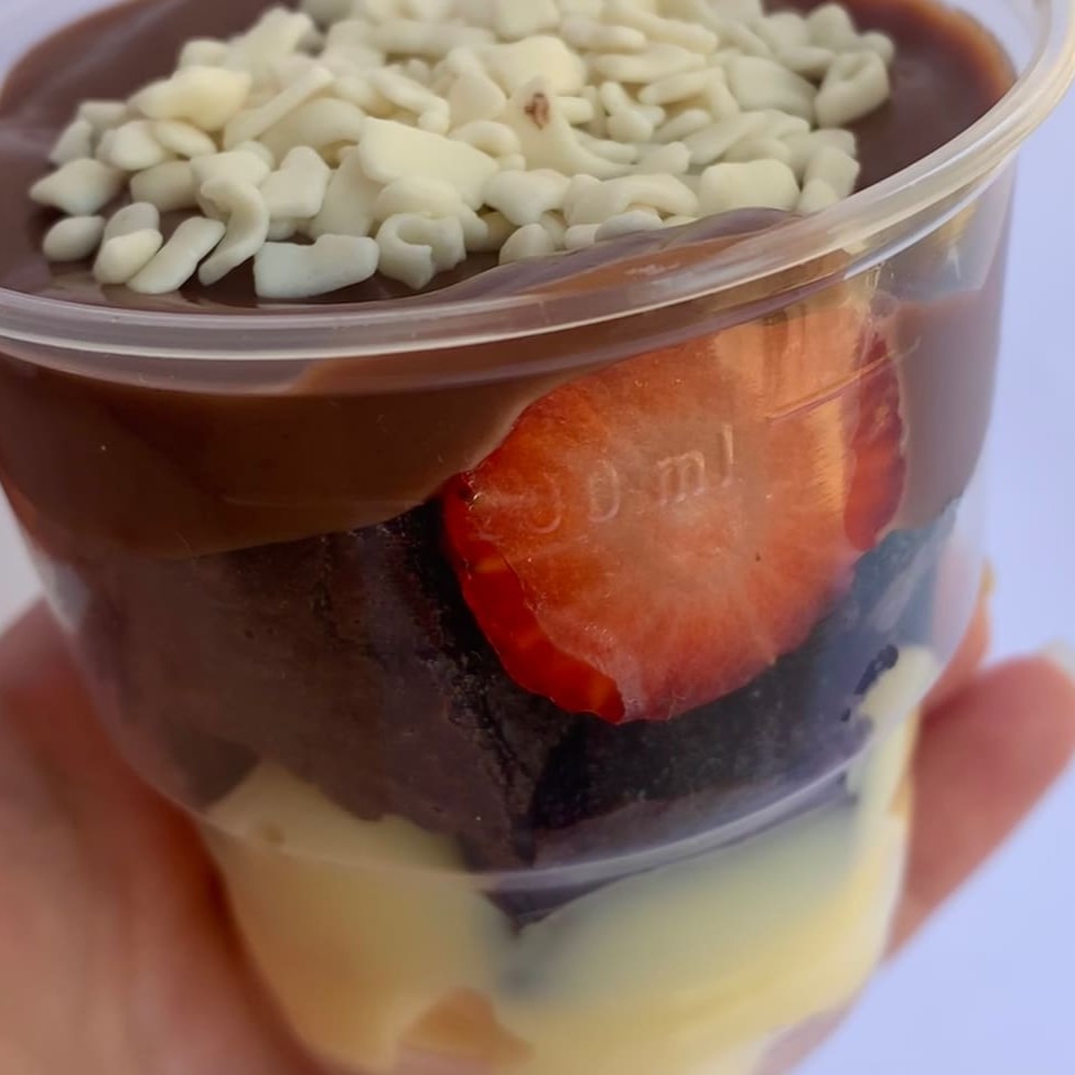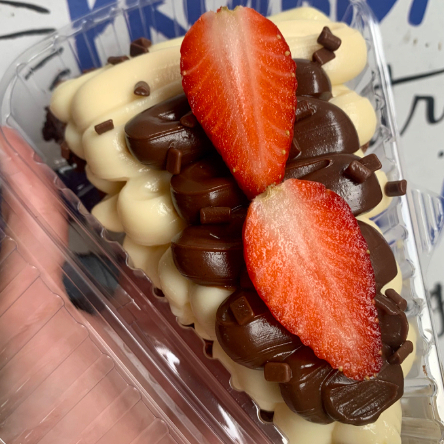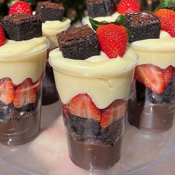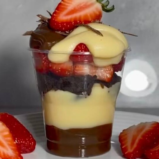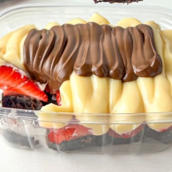 Brownie molhadinho + 1 camada generosa de creme de Ninho + uma camada de brigadeiro gourmet, finalizado com Morangos frescos e granulado artesanal.