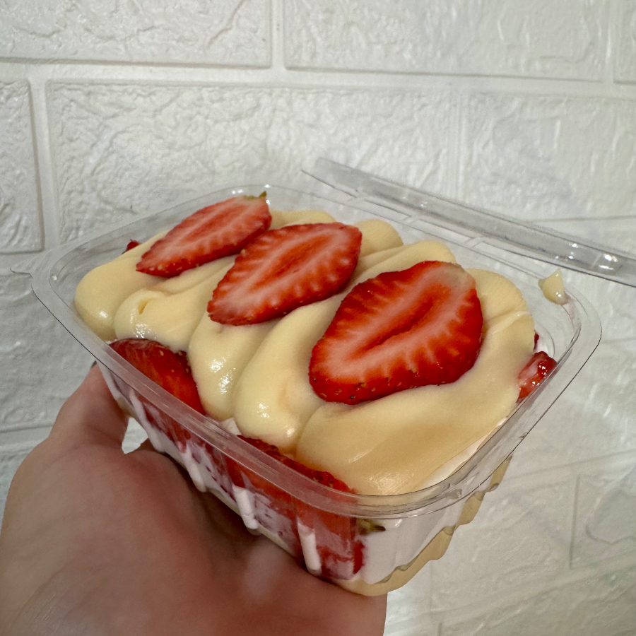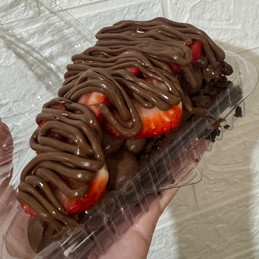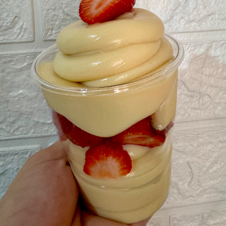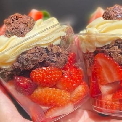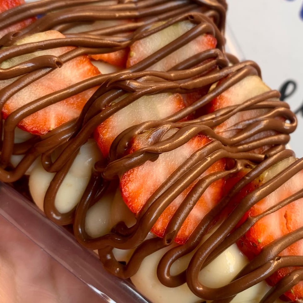 Brownie molhadinho + 1 camada generosa de creme de Ninho + uma camada de brigadeiro gourmet, finalizado com Morangos frescos e granulado artesanal.