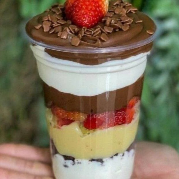 Nosso copo da felicidade artesanal, leva, uma camada de creme de Ninho, uma camada de browne, uma camada de morangos frescos, finalizado com uma camada de brigadeiro de chocolate gourmet e granulado.