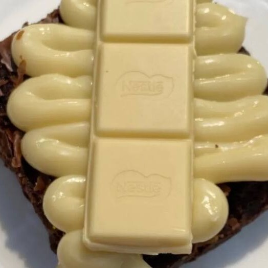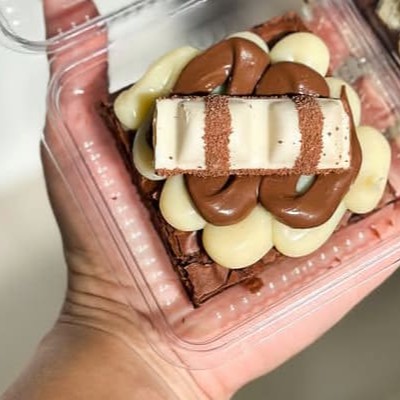Brownie maravilhoso, com a casquinha por fora + creme de Ninho e brigadeiro Gourmet, finalizado com pedaços de Kinder Bueno.