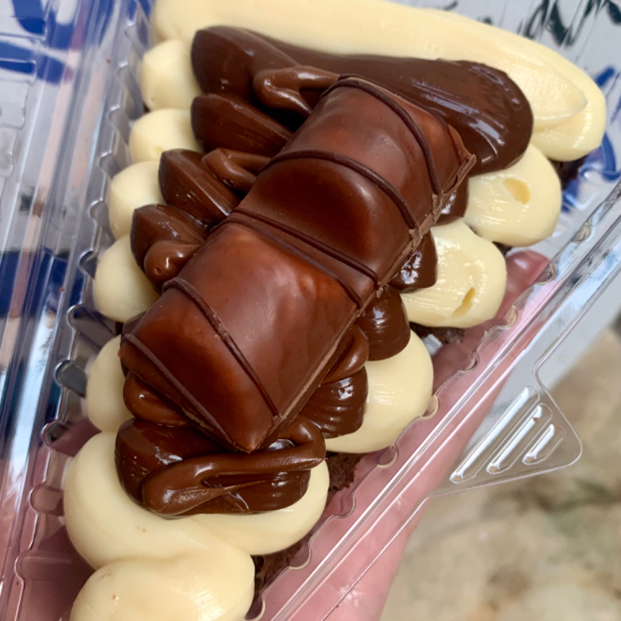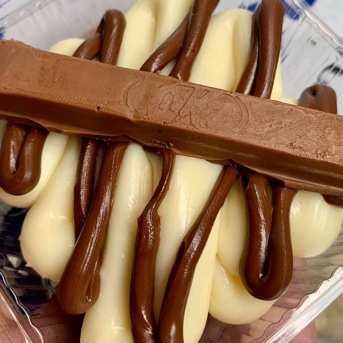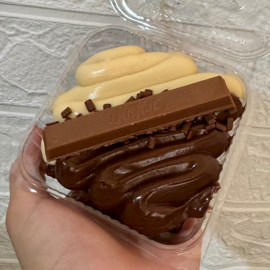 Brownie molhadinho + casquinha perfeita, brigadeiro de Ninho + brigadeiro 50% cacau, finalizado com Kit Kat inteiro.