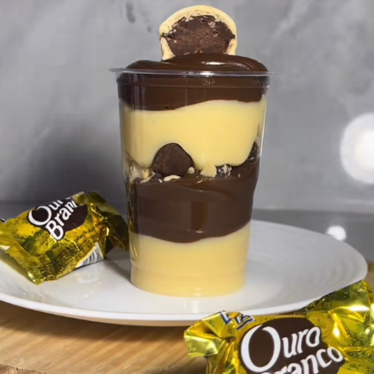 Copo OURO BRANCO ORIGINAL, inicia com um brigadeiro de chocolate branco suave+ brigadeiro 50% + pedaços de ouro branco finalizado com brigadeiro de ninho e brigadeiro. SUPER NOVIDADE POR AQUI!