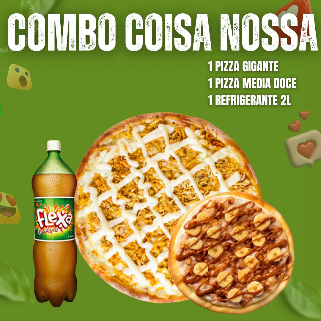 Experimente o nosso 'Combo Coisa Nossa 1', dentro da Categoria 'Promoção Popaye'. Uma combinação verdadeiramente brasileira com a autêntica Pizza Maracanã, repleta de sabor e tradição, acompanhada pelo refrescante Guaraná Antarctica de 1,5 , bebida emblemática do nosso país. E para finalizar com um toque doce, uma pizza média doce, que vai tornar a sua experiência ainda mais deliciosa e inesquecível. Aproveite!
