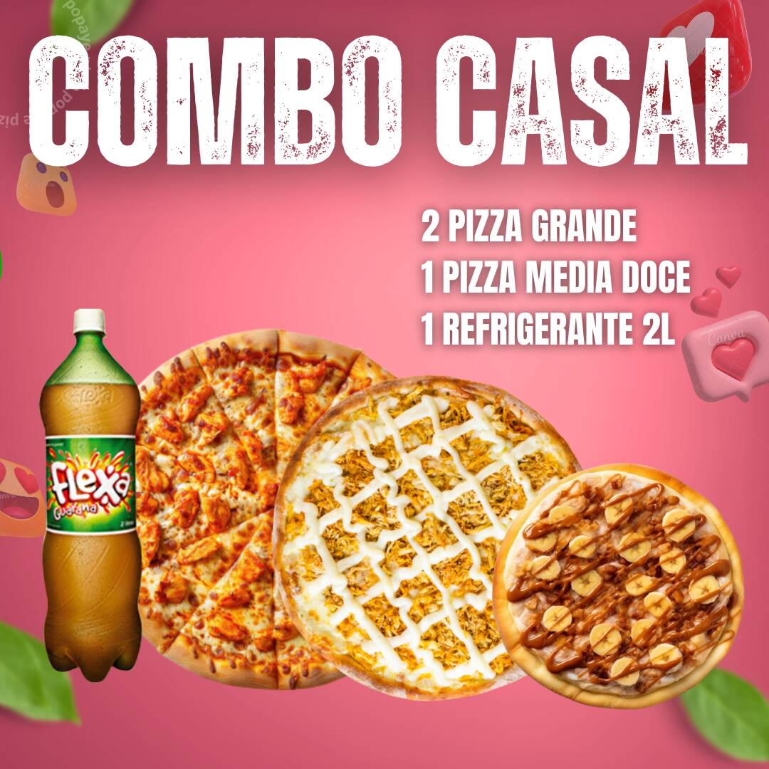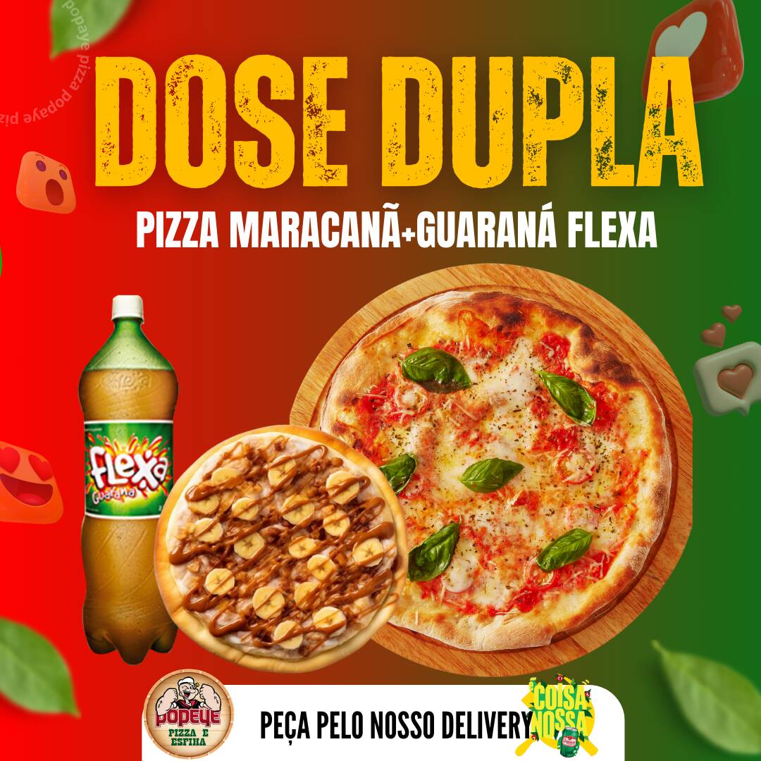 Experimente o nosso 'Combo Coisa Nossa', dentro da Categoria 'Promoção Popaye'. Uma combinação verdadeiramente brasileira com a autêntica Pizza Maracanã, repleta de sabor e tradição, acompanhada pelo refrescante Guaraná Antarctica, bebida emblemática do nosso país. E para finalizar com um toque doce, uma pizza média doce, que vai tornar a sua experiência ainda mais deliciosa e inesquecível. Aproveite!