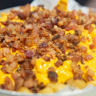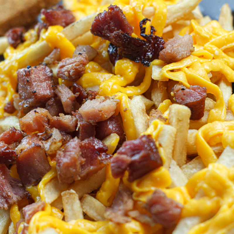 Deliciosa porção de batata frita palito com bacon torrado e o mais saboroso cheddar melt derretido