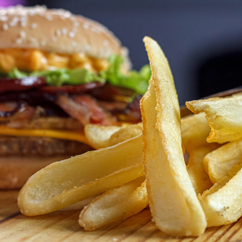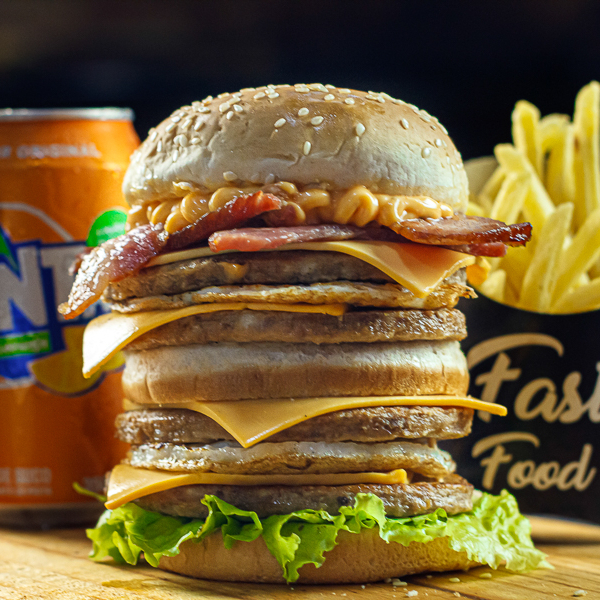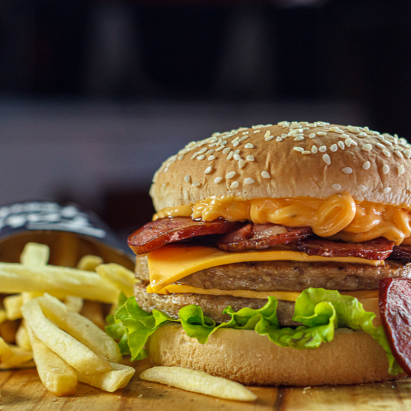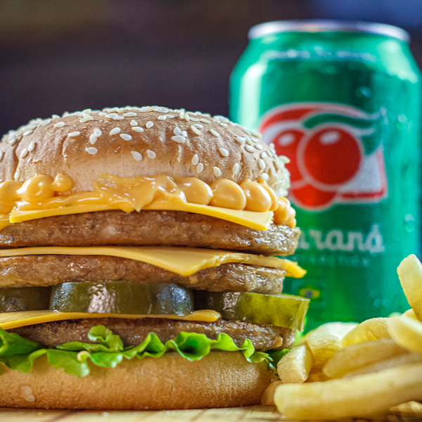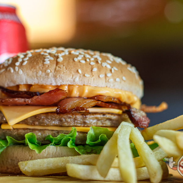 Hambúrguer + batata + refrigerante em Lata (Pão com gergilim, 2 carnes 56g, 2 queijos, salada e muito bacon)
