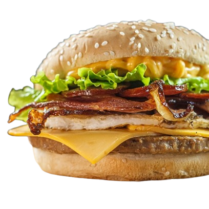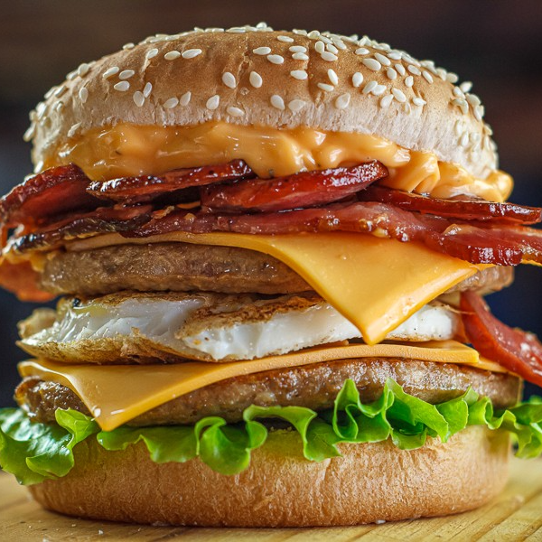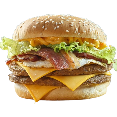 Duplo Egg Bacon Picanha (Pão Big com Gergilim , 2 carnes sabor picanha 120g ,3 queijos, bacon , ovo molho e salada.)