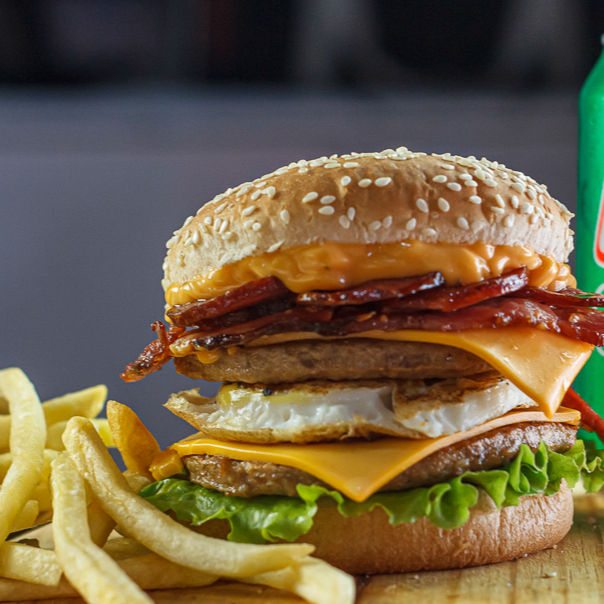 Duplo Egg Bacon Picanha + batata + refrigerante em Lata (Pão Big com Gergilim , 2 carnes sabor picanha 120g ,3 queijos, bacon , ovo molho e salada.)