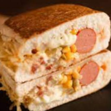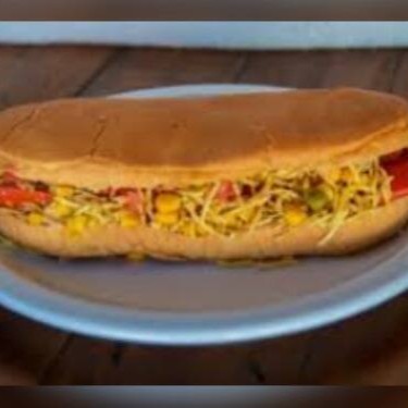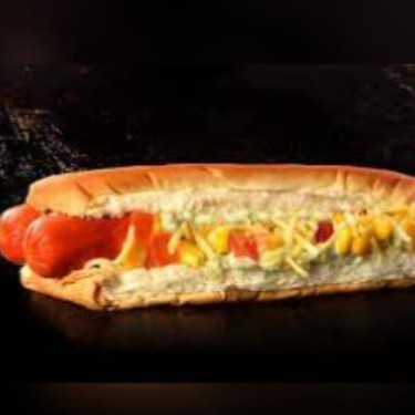 Pão, salsicha ou linguiça, ketchup, maionese, milho, ervilha, batata palha e cheddar cremoso.