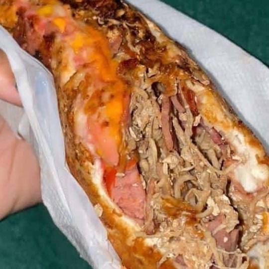 Salsicha ou Linguiça, frango, calabresa, milho, ervilha, tomate, cebola, ketchup, maionese e batata palha.