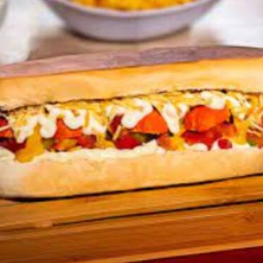 Salsicha ou Linguiça, calabresa, Catupiry, milho, ervilha, tomate, cebola, ketchup, maionese e batata palha.