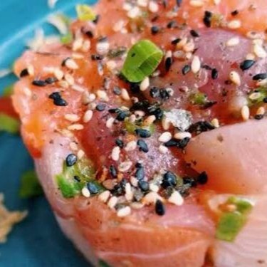 Mix de salmão, atum e peixe branco temperados, gergelim e cebolinha.