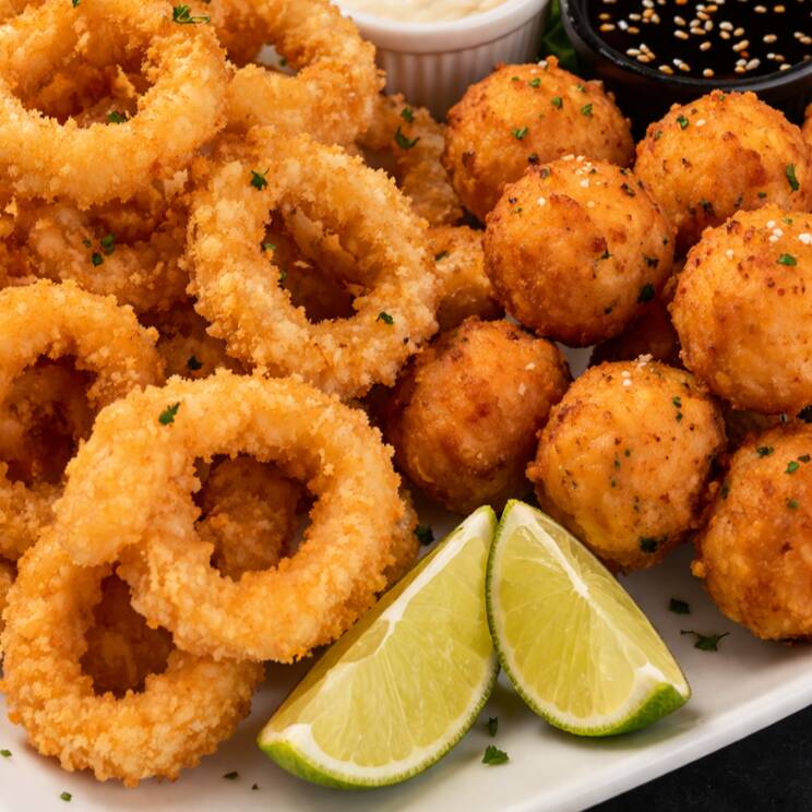 12 unidades de lula temperada, empanada e frita + 6 bolinhos de salmão