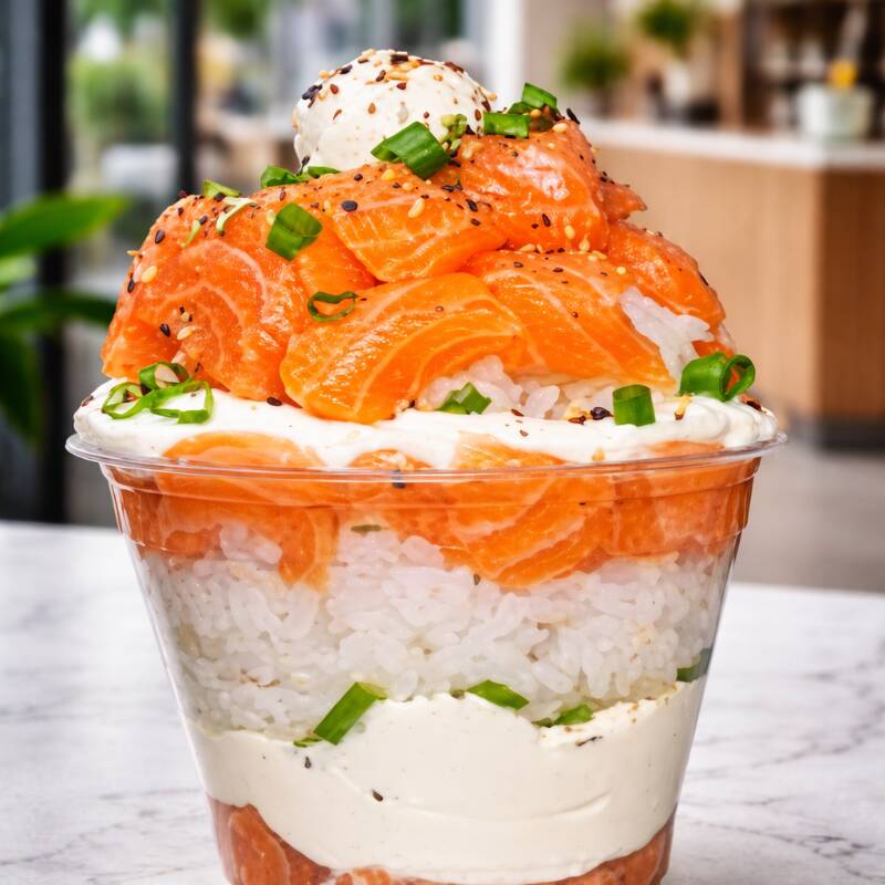 Camadas de salmão fresco, arroz japonês e cream cheese cremoso, finalizado com salmão maçaricado e cebolinha.
