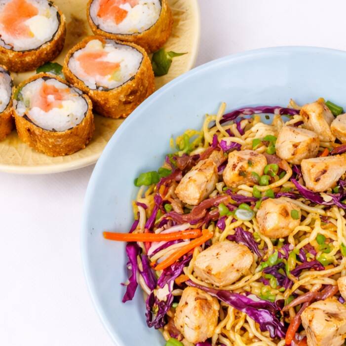Yakisoba de frango 500G + 6 hot philadelphia + 4 Lula empanada e frita