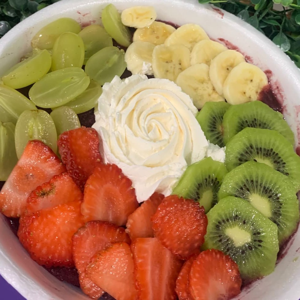Delicioso Açaí, Frutas da Casa Fatiadas (Morango, Uva, Kiwi e Banana), Chantilly e Leite Condensado.