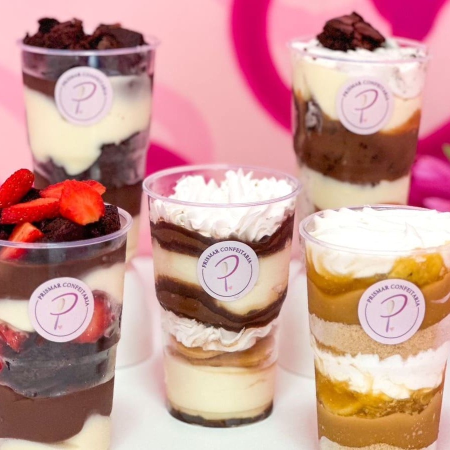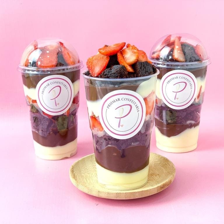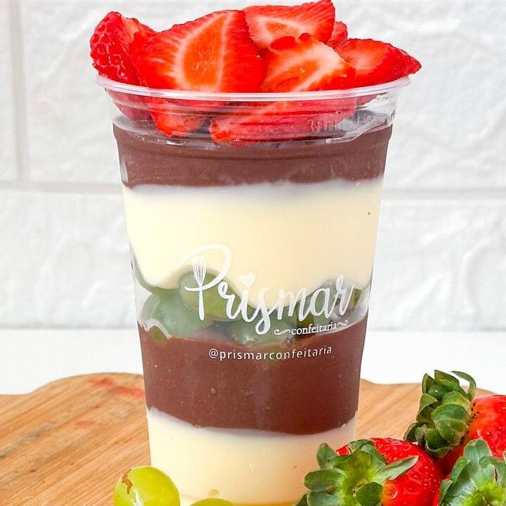 Creme Prismar bem cremoso, camadas de uva sem caroço, brigadeiro cremoso, pedaços de morangos frescos, simplesmente sensacional