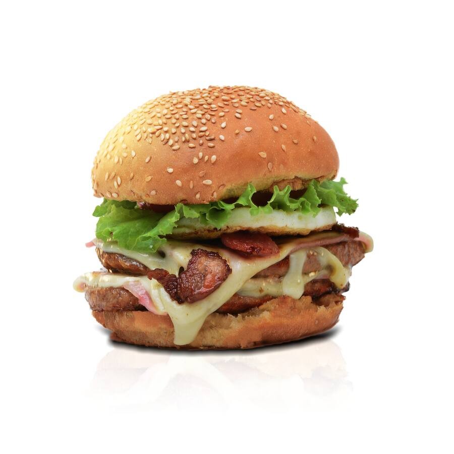 Pão de hambúrguer artesanal, 02 hambúrgueres bovinos, ovo, bacon, mussarela, presunto e salada