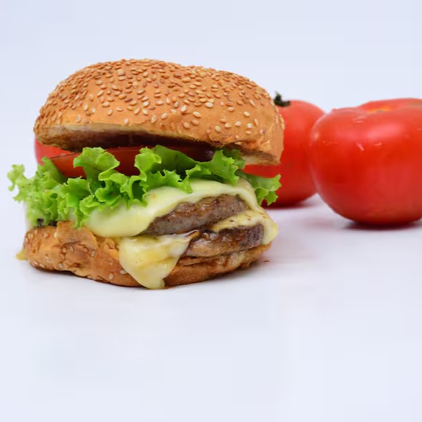 Pão de hambúrguer, 02 hambúrgueres bovinos, mussarela e salada