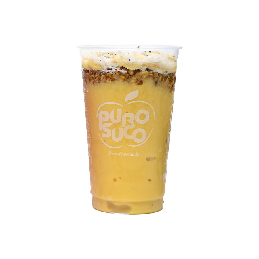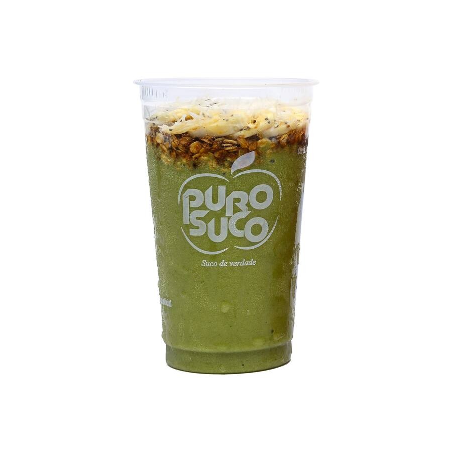 Banana, espinafre, manga, abacaxi e gengibre. Servido com granola, banana picada, côco ralado, chia e mel.